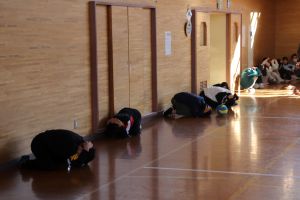 子どもたちは体育館や校庭、廊下等にいた場合の身を守る行動をしました。