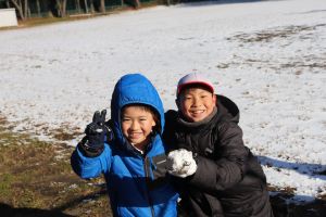 積雪は少なくても、しっかりと雪だるまを作ってピース。