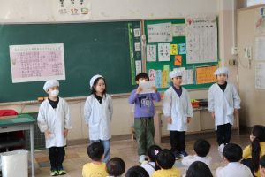 また、「給食の白衣の着方」「名札のつけ方」については実際に体験してもらいました。