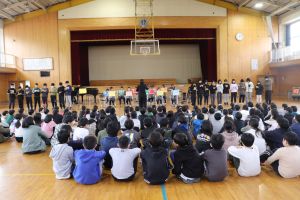 今日は全校児童に、昼休み時間を使って音楽のプレゼントをしてくれました。