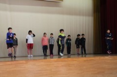 中休みのマラソンも明日で終了です。来週から中休みは縄跳びが始まります。そこで、今日の全校朝会では、体育委員会の子どもたちが縄跳びの跳び方を見せてくれました。いろいろな跳び方を見せてくれて、低学年の子どもたちからは歓声が上がっていました。来週から縄跳びがんばりましょうね。