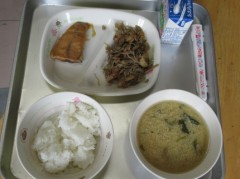ご飯は、アルミパックではなく、飯わんに盛り付けていただきます。お皿は仕切り皿になり、2種類のおかずが混じることなく食べられるようになりました。麺の日は、大きいサイズのめんどんぶりになったので、麺とスープを混ぜる苦労がなくなりました。食器には、実際に是川縄文遺跡から発掘された土器のキャラクター「いのるん」などがプリントされています。