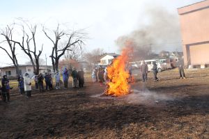 お正月飾りを燃やした煙を浴びて、今年一年の無病息災をお祈りしました。その後、子ども会でかるた大会に向けて練習を行いました。