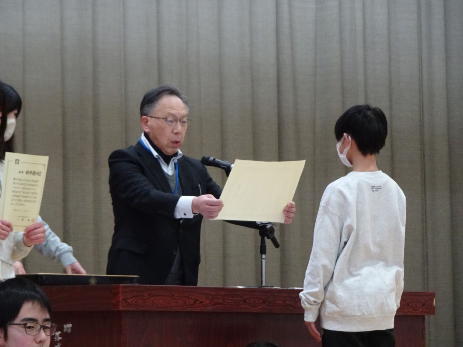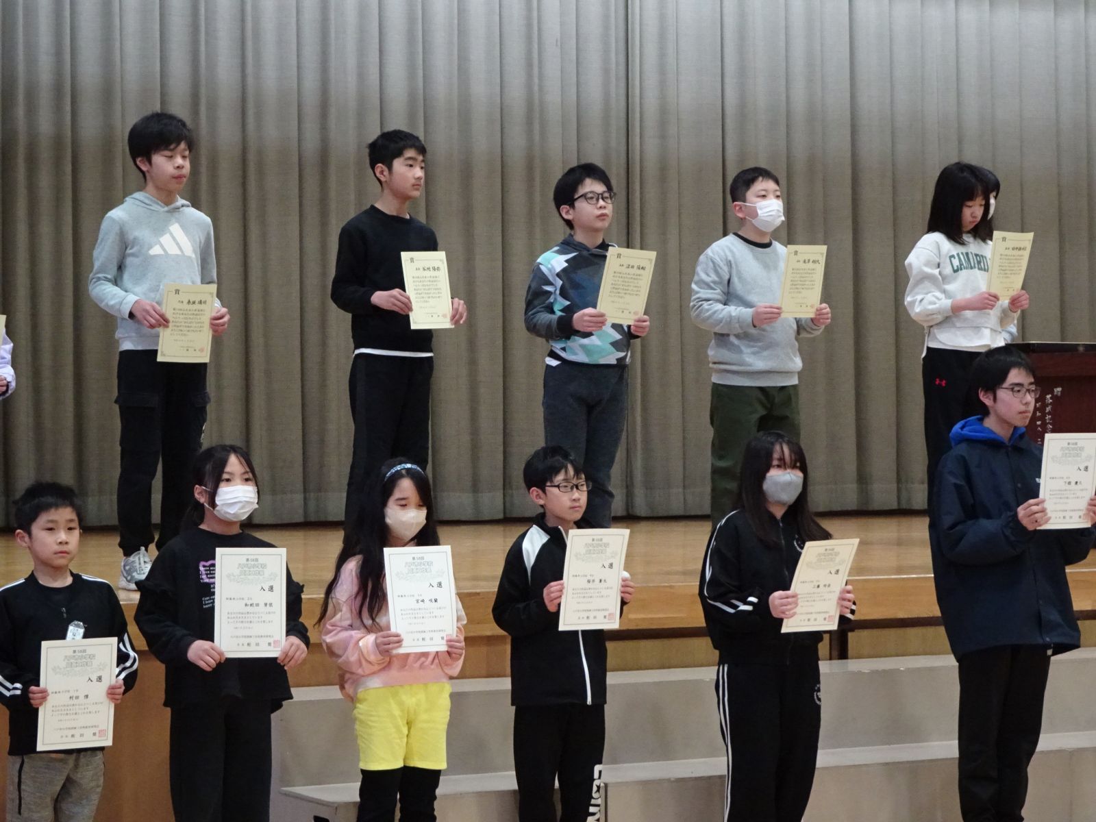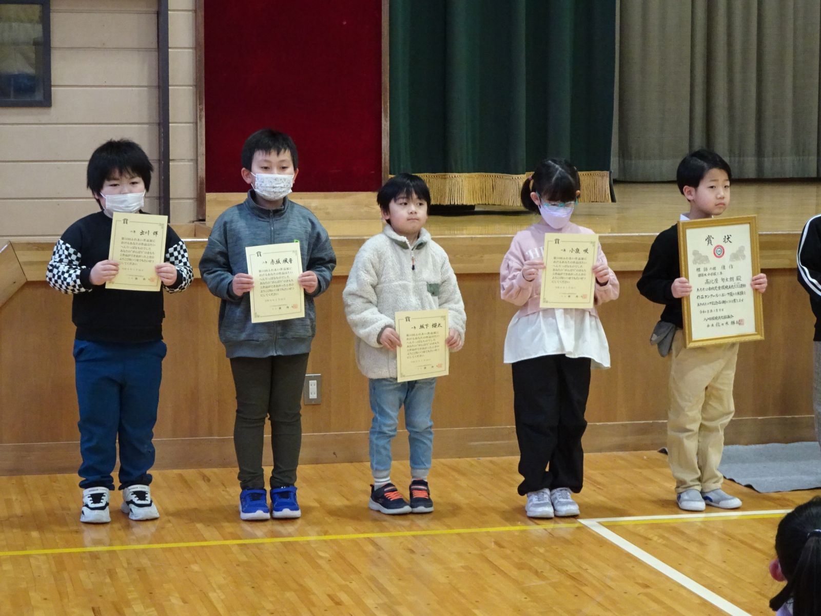 市内お話弁論大会、都市ガス安全使用に関する習字展、青森県やさい作品コンクール、市内図工展、八戸市環境美化530運動児童作品コンクール、ふれあい作品展、文集はちのへ、小学校のぼうさい探検隊マップコンクールの入賞者に、それぞれ賞状が手渡されました。