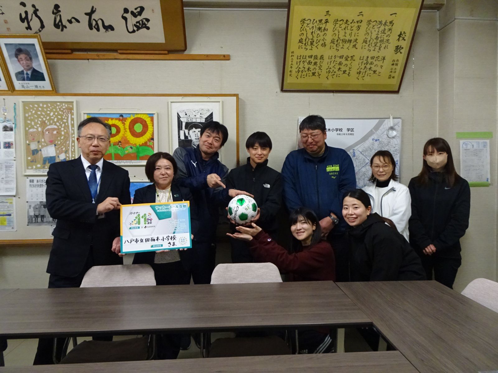 寄贈していただいたボールは、新体制のヴァンラーレ八戸の選手のサイン入りボールです。