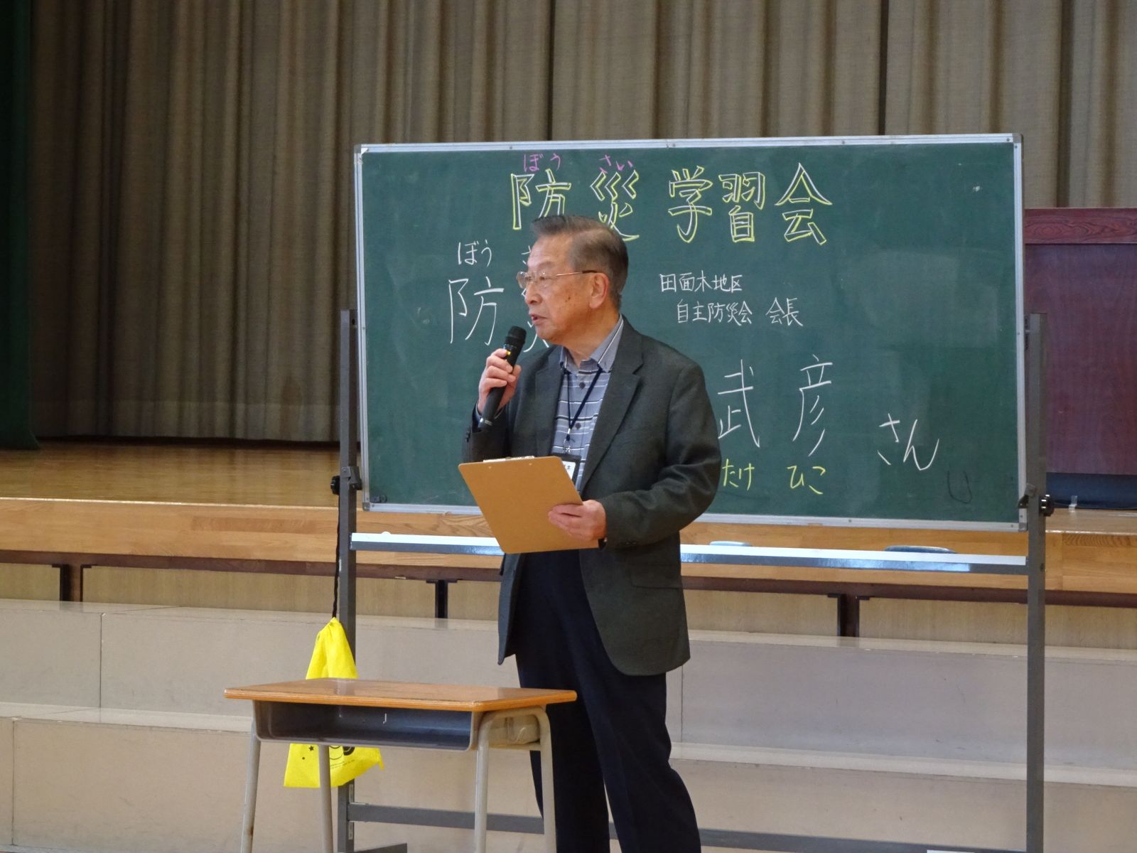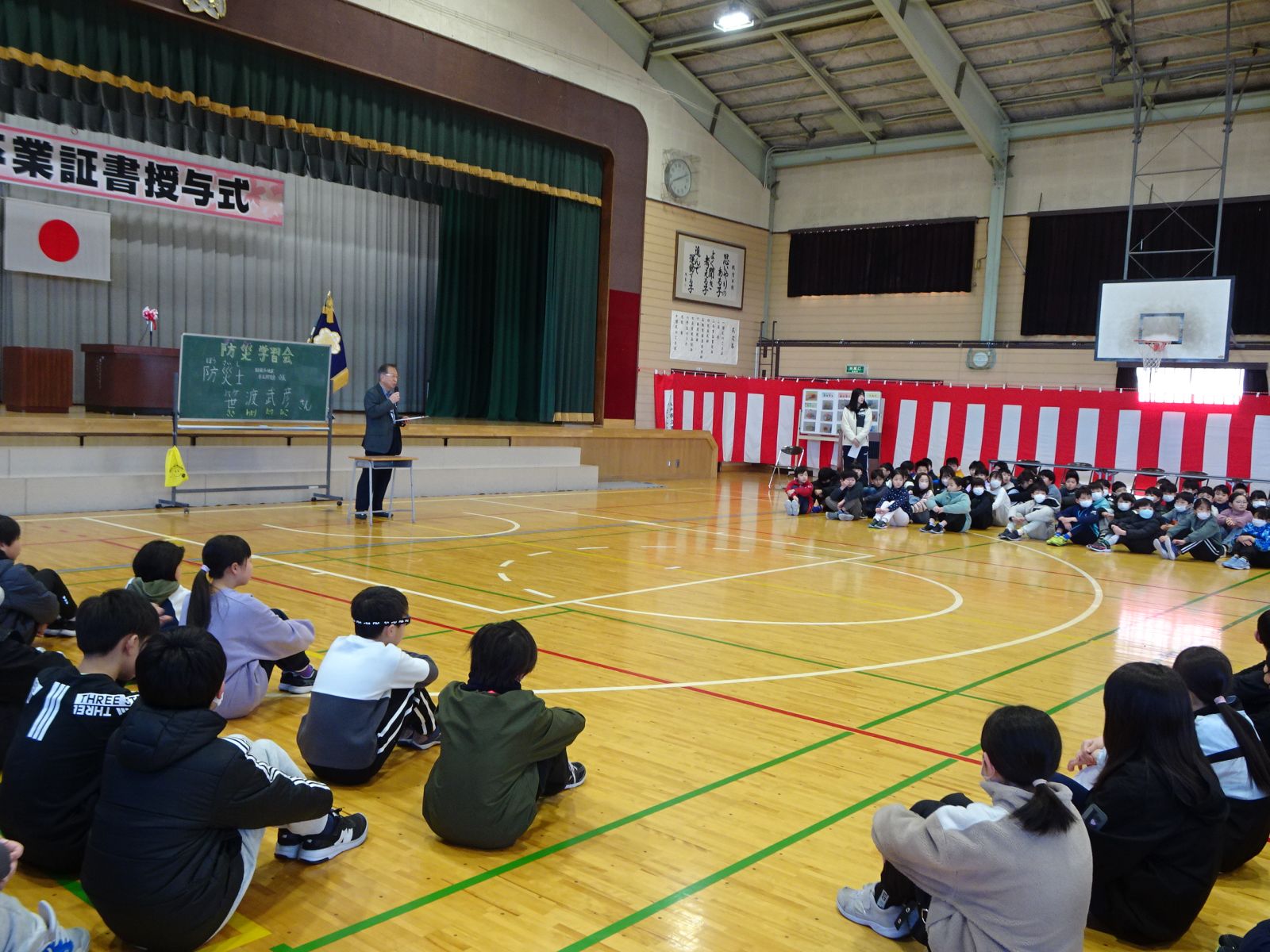 昨年12月の大きな地震を例に、家庭でどのような取組をしているのか子どもたちに確認をしながら学習会が進みました。