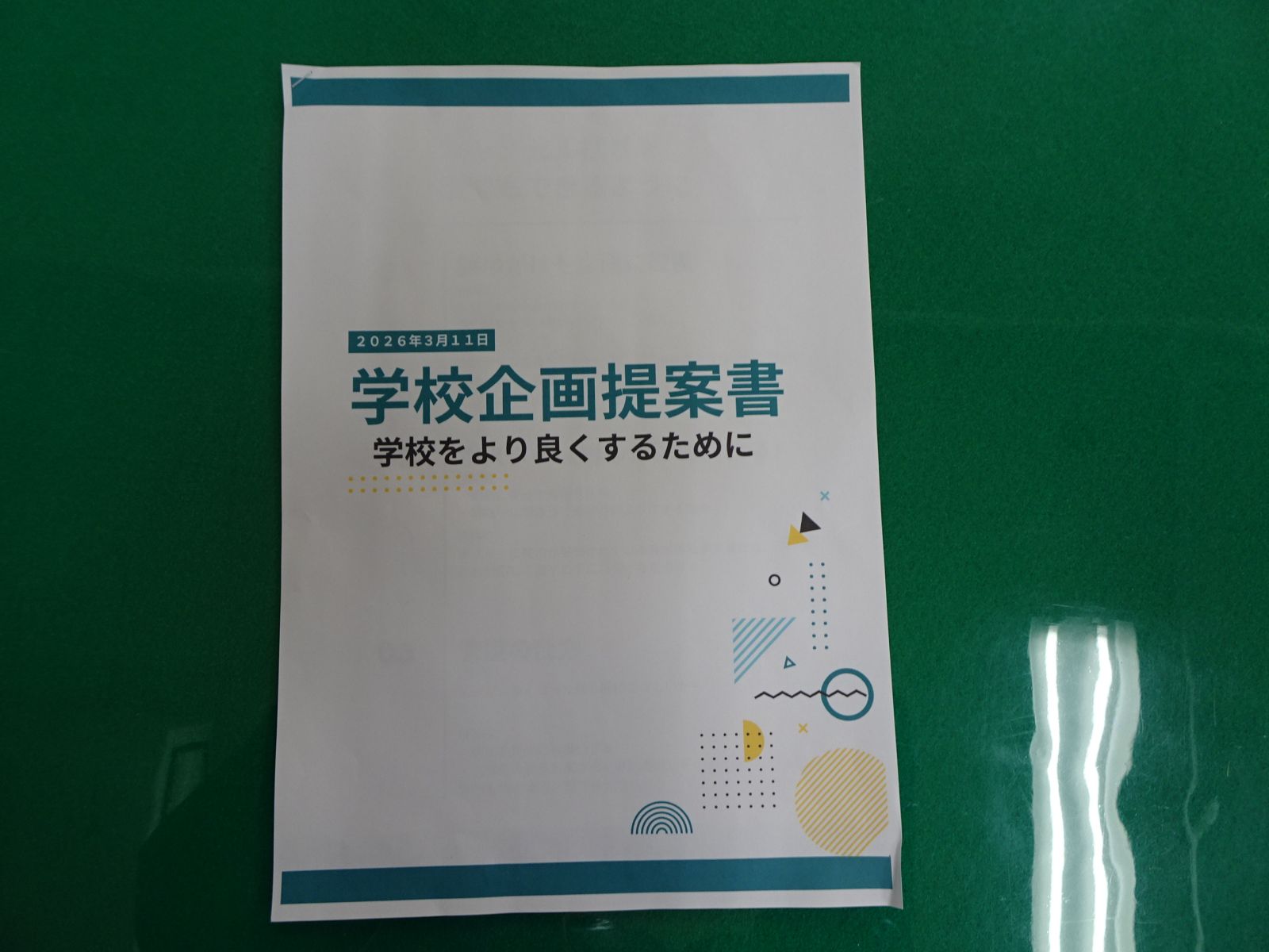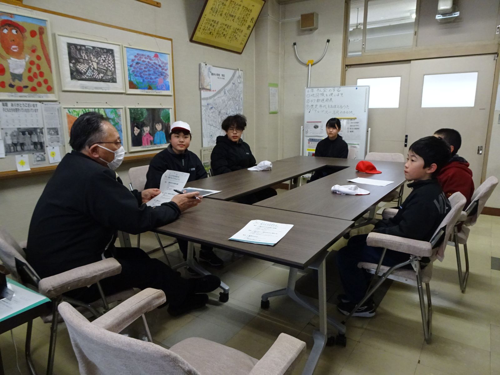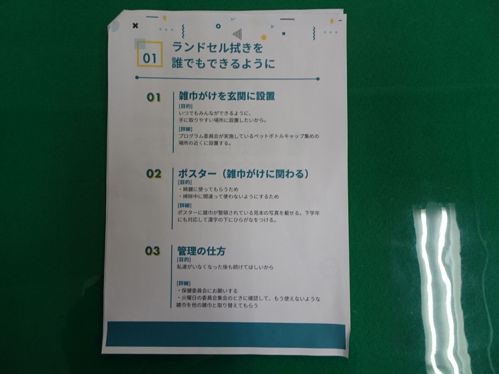 そして、今回は玄関にランドセル拭きの雑巾を常設したいという取組について企画書を作成し、校長先生に説明を行いました。