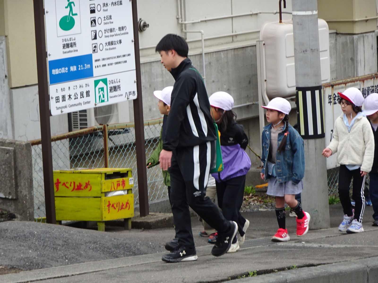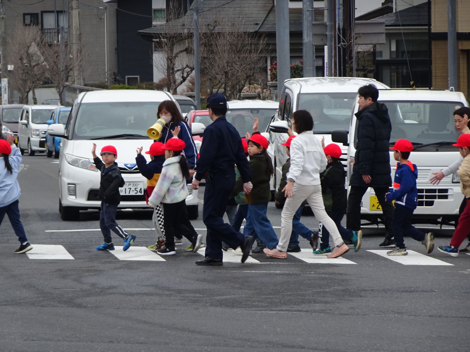 全校で、命を守るためには周りをよく見て歩くことが大切、というお話を聞き、その後、1・2年生は実際に道路を歩いてみました。