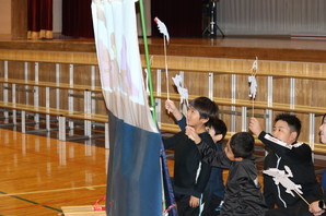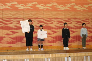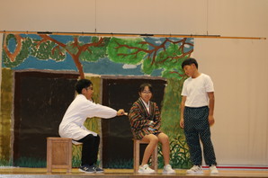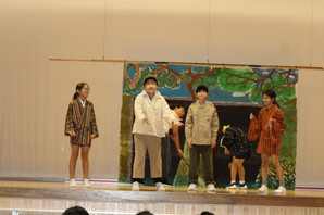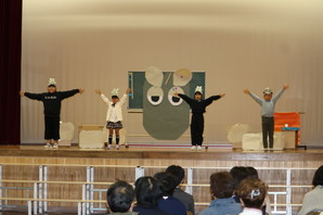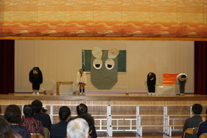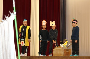 3,4年生の劇「ピーチボーイ」。南部弁と英語を交えた面白い劇と影絵で盛り上げました。