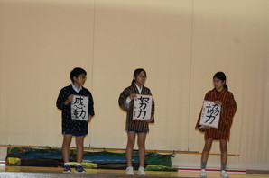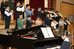2年生のはじめの言葉。そして全校合奏「ルパン三世のテーマ」。今年は教職員も参加しました。