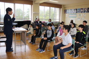 4月23日、種差駐在所のおまわりさんにおいでいただき、交通安全教室を行いました。まず、おまわりさんから全校児童に交通安全に関するお話をしていただきました。その後の質問コーナーでは、自転車に乗るときや歩くときに気を付けることについて、たくさん質問をしていました。講話の後は、2年生が実際に道路の歩き方について指導してもらいました。いよいよ自転車乗りが解禁となります。安全に気を付けて事故がないように自転車に乗りましょう。