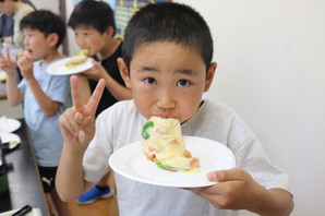 2日目の午前はフライパンピザづくりです。生地から作りました。こねるのがとても難しいようでしたが、平べったく伸ばしてから具材を散らし、フライパンで上手に焼き上げることができました。自分達で作ったピザは絶品でした。