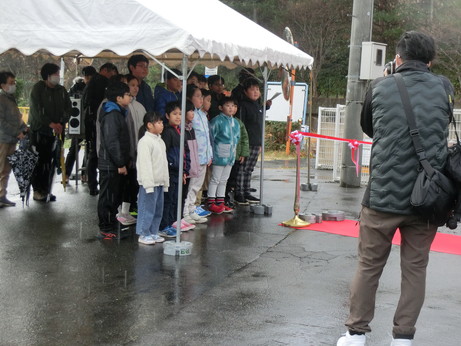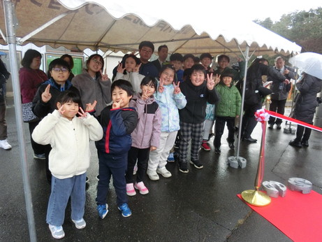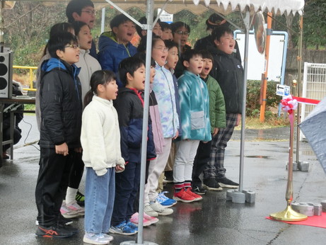 本校の児童はセレモニーの一番最初に校歌を歌ってお祝いしました。あいにくの雨だったのでテントの中での斉唱となりましたが、みんなで元気に歌ってセレモニーに花を添えました。