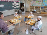 轟木小学校は今日から1年生も給食開始です。午前中4時間勉強した後、3人で協力して素早く準備しました。カメラを持って行ったときには、先生も加わって、仲良く楽しそうに食べていました。今日は、パンとシチューの献立です。好き嫌いがないと言っていた3人です。これからの献立も楽しみですね。