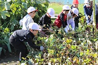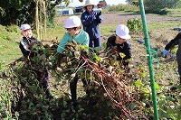 2校時は、1・2年生がサツマイモを収穫しました。まずは、ツルを片付けます。力いっぱい引いて、転んでもすぐ立ち上がって、ツルを片付けました。