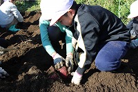 続いて、いも掘りです。サツマイモを折らないように、手で少しずつ土を払っていきます。サツマイモが見えるたびに、子供たちは大歓声。大物も収穫できて、大満足のようです。