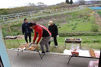 裏方をのぞくと、バザー開始に間に合わせるために、お父さんたちが焼き鳥を焼き続けてくれました。10時30分、PTA会長さんの合図でバザー開始です。