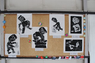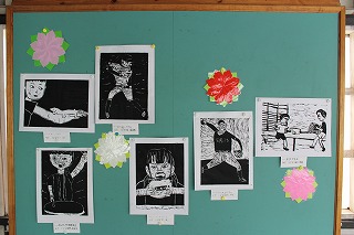 体育館への渡り廊下に、2・3年生と6年生の図工作品が掲示されています。いずれも力作です。