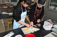 2校時の家庭科の時間になったら、ごはんとみそ汁の担当に分かれて調理開始。みそ汁は、具の切り方にも注意して準備を進めます。ごはん担当は、タイマー片手に火の強さを調節しました。