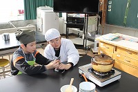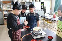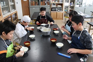 時間どおりに作業を行って、完成しました。いよいよ試食。ごはんもみそ汁もおいしくできたようです。おうちでも手伝ってあげるといいですね。
