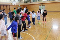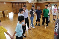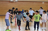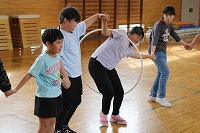 今日の昼休みは、6年生が企画したフラフープリレーです。見た目は簡単なのですが、いざ競争となると、お互いの息を合わせるのが難しく、思うように進まないシーンも見られました。ALTの先生も参加してくださり、大いに盛り上がりました。1回目は赤チームが勝ち、2回目は白チームが勝って、楽しい昼休みとなりました。