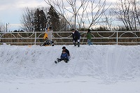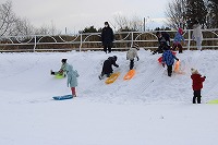 2・3年生がそり遊びをしていました。雪が降って、そりにもってこいです。時間がたつと、うつ伏せや後ろ向きなど、いろいろな滑り方で楽しんでいました。