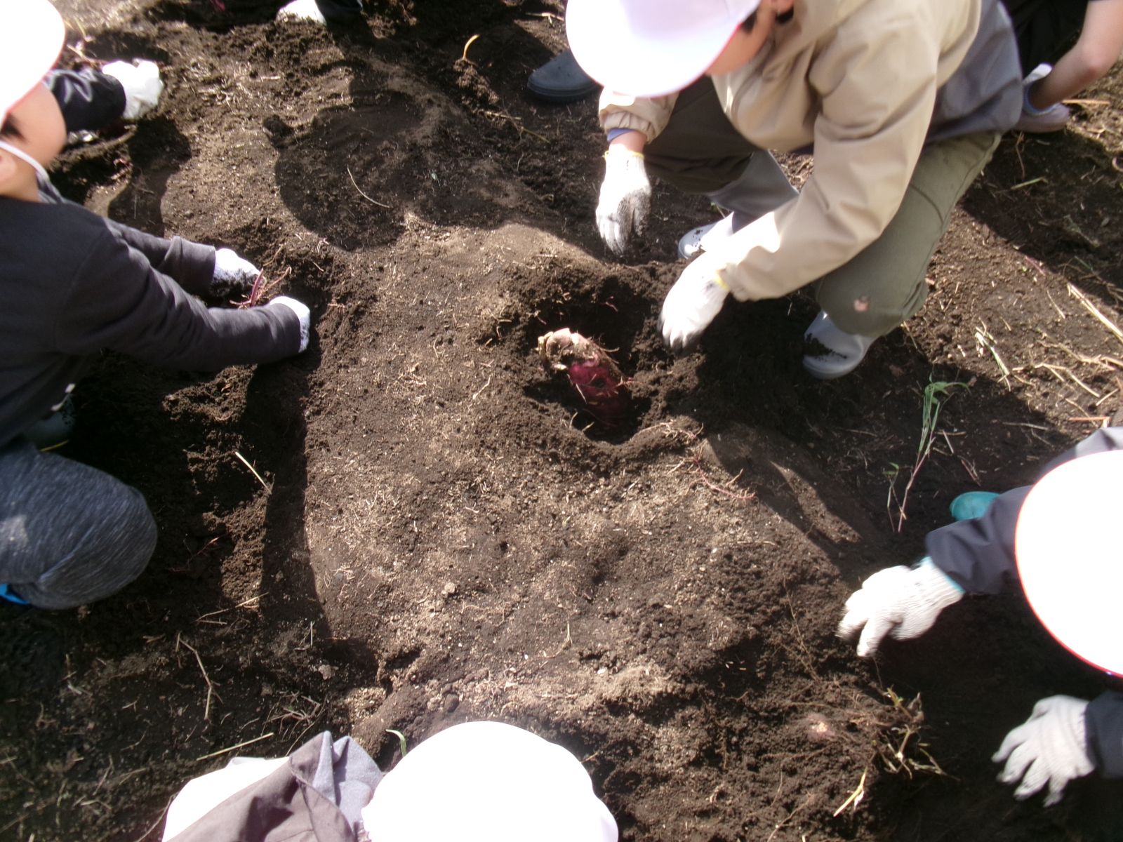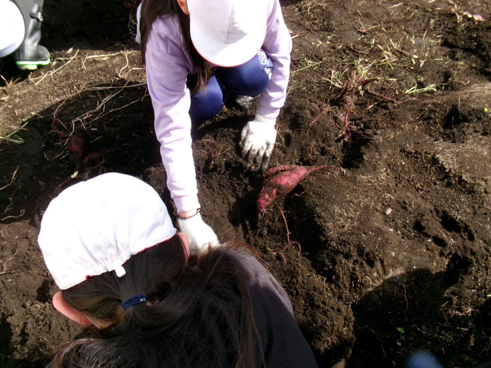 10月23日(木)、気持ちのいい天気の中、これまでなかよし班で育ててきたサツマイモの収穫をしました。