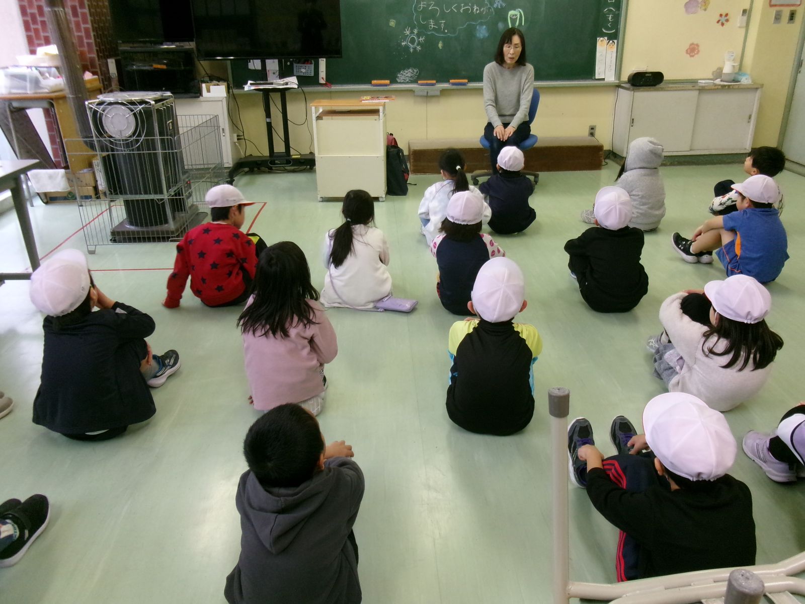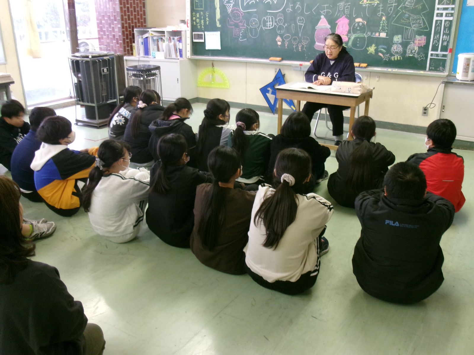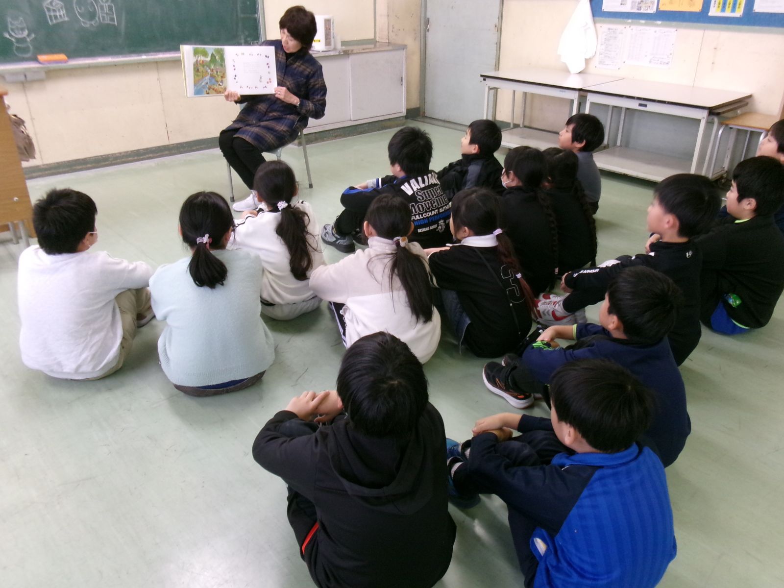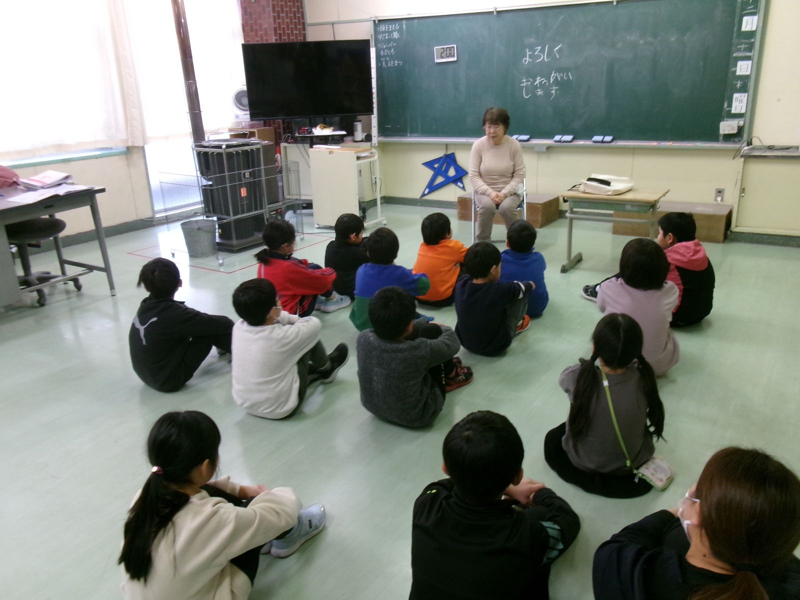 教室には、雨の音も聞こえますが、子どもたちは、ボランティアの方々の魅力的な昔語りや読み聞かせに夢中です。