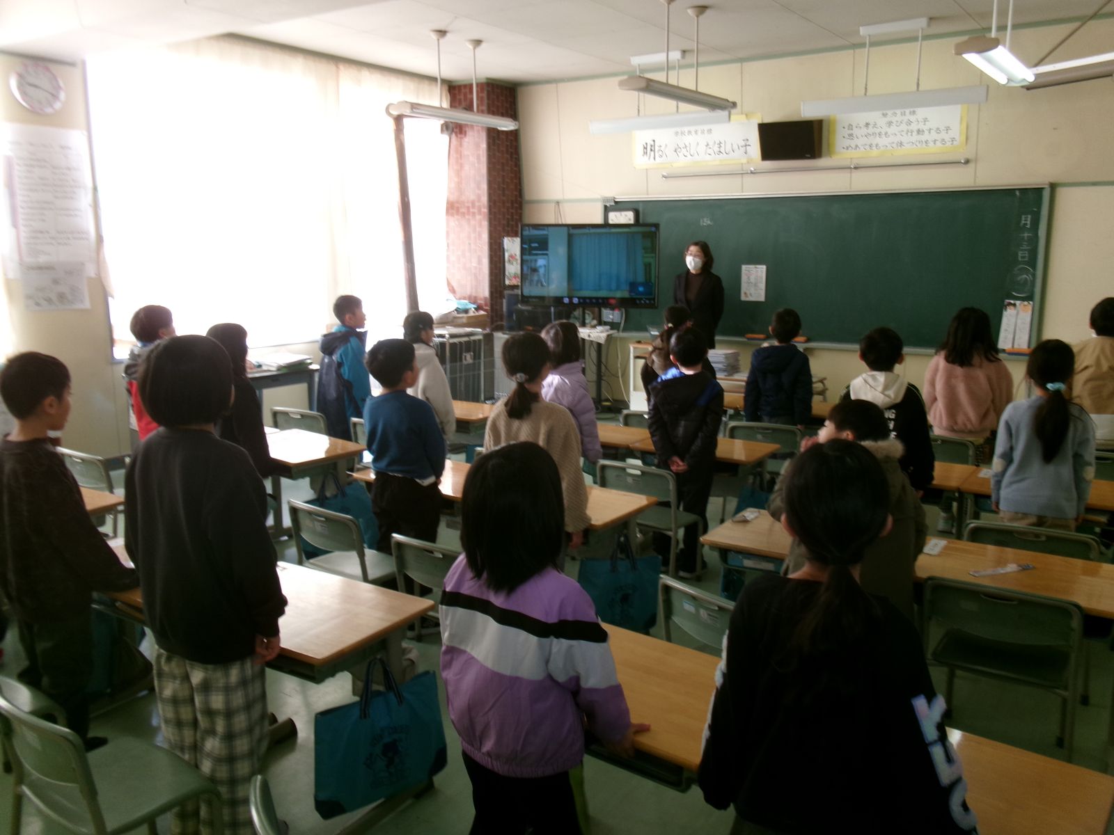 朝から雪が舞い、気温は低かったですが、子どもたちの「おはようございます」という元気な声が学校に戻ってきました。子どもたちの笑顔から、充実した冬休みであったことがうかがえました。