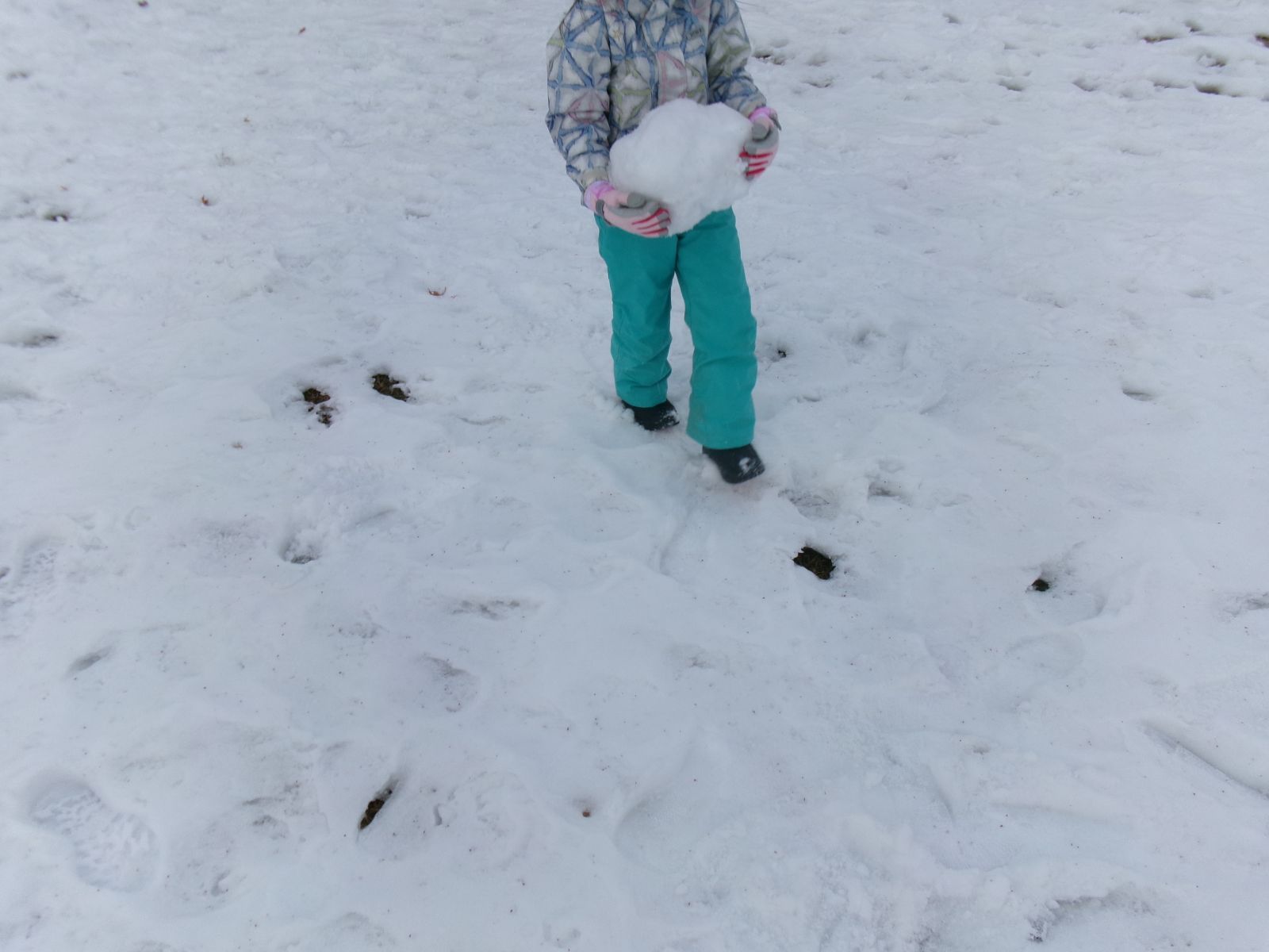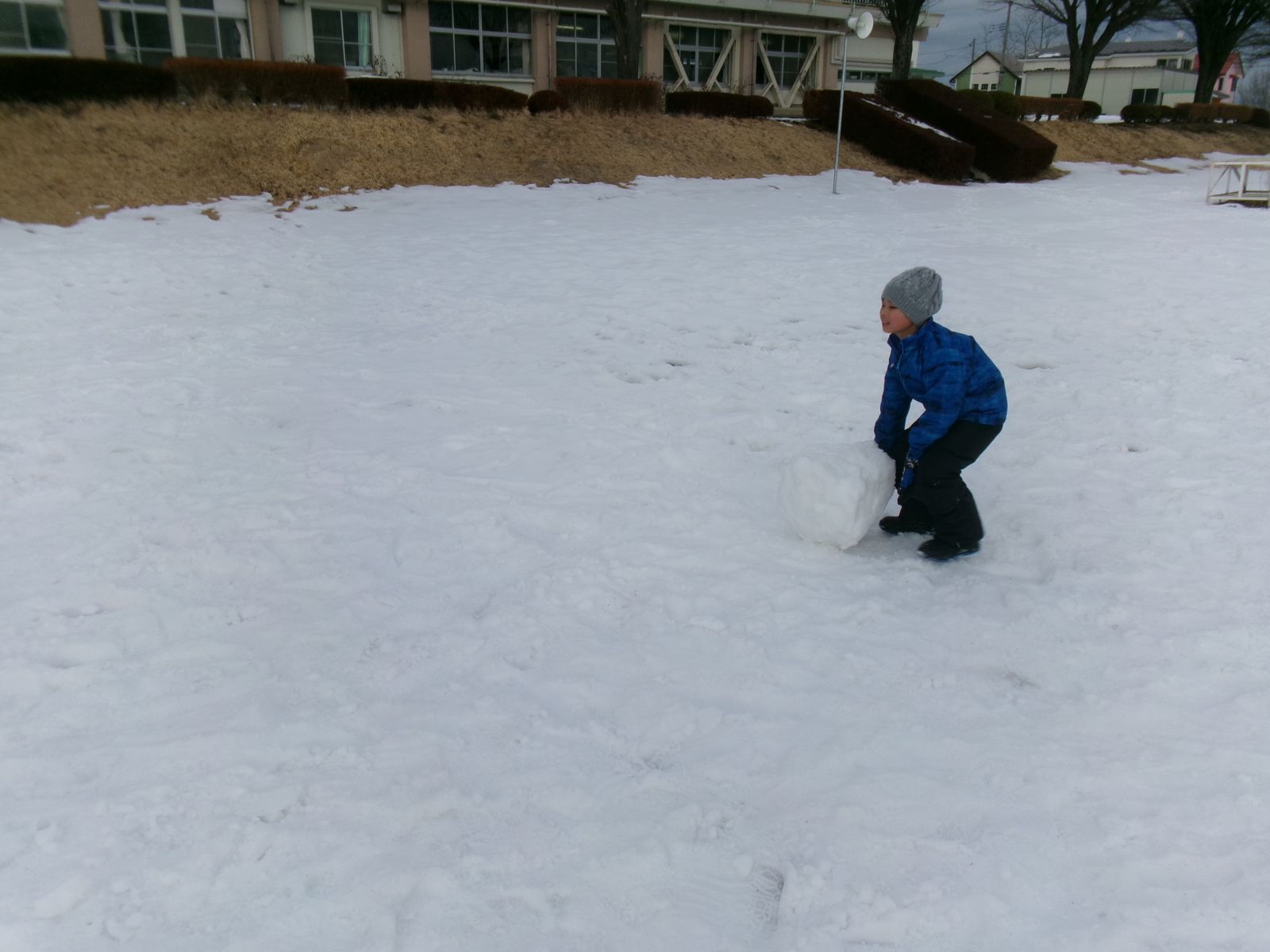 雪の積もる校庭、雪が解けた土手。