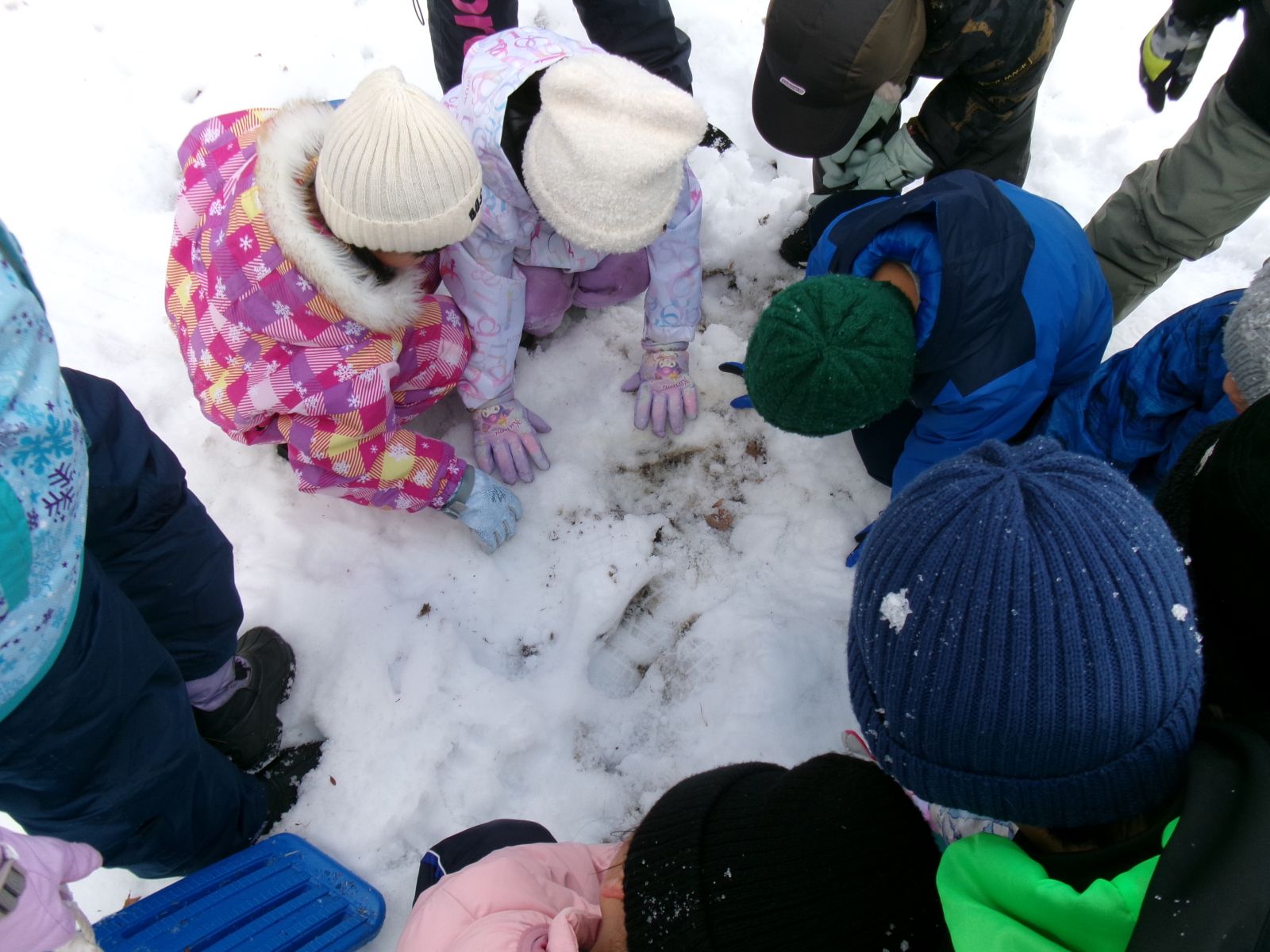 みんなで一度集まり、担任の先生と生活科の学習で学んだ「霜柱」を見つけ、じっくりと観察しました。