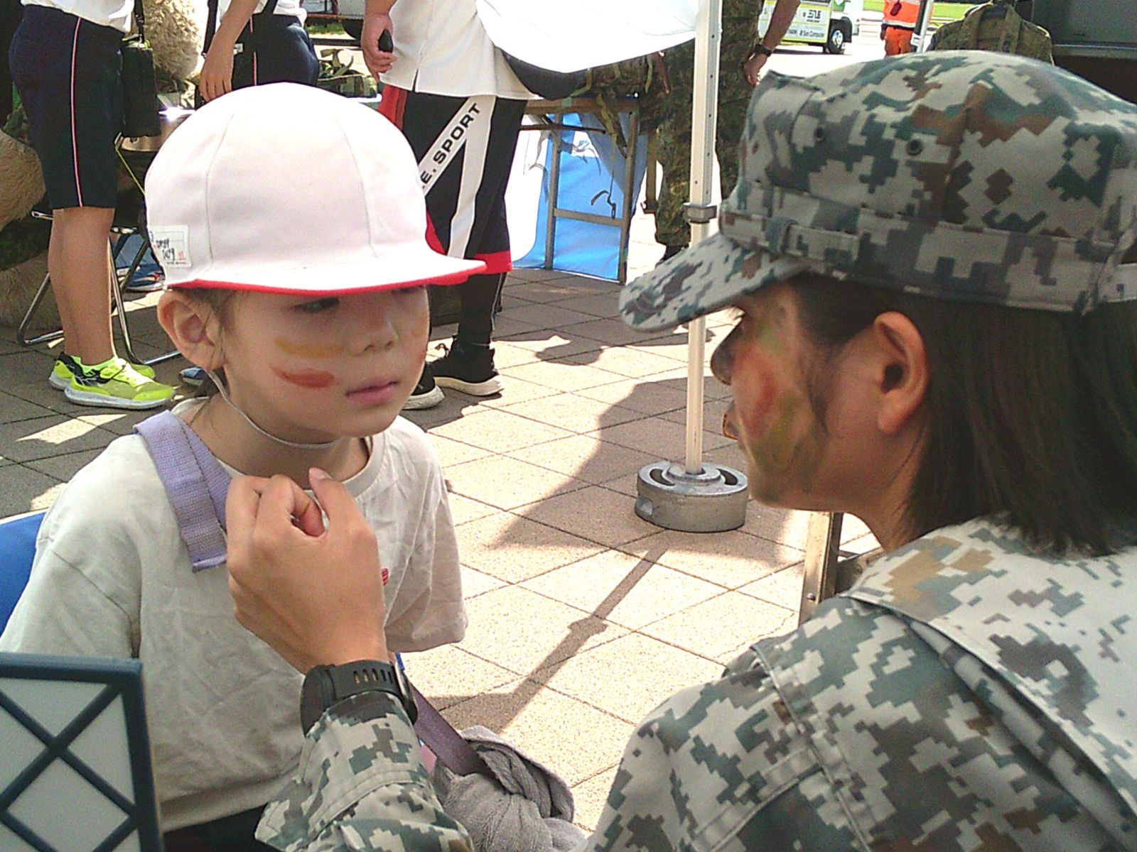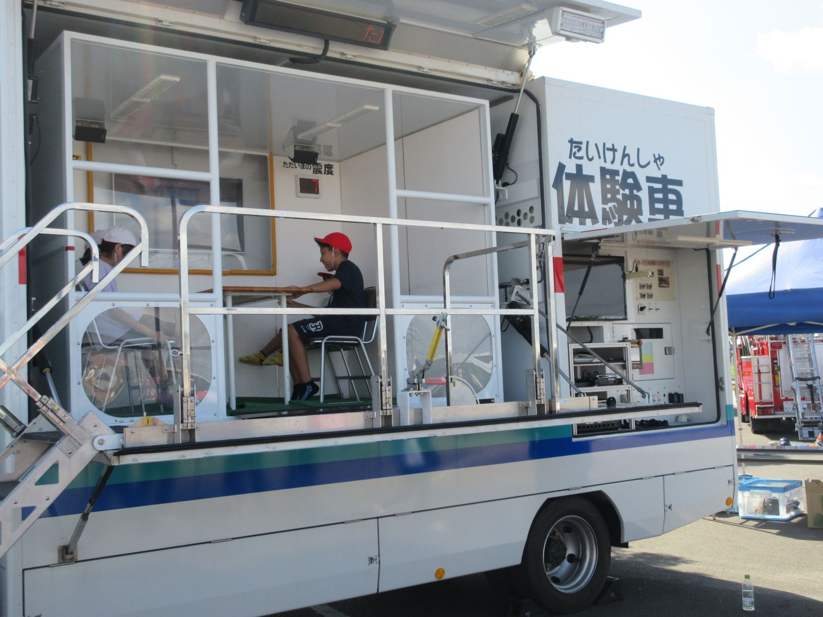 職業体験のブースでは、自衛隊員の迷彩メイク、運送業としてのトラック乗車体験、防災意識向上のための震度7体験などなど。子どもたちは興味深々です。貴重な体験をすることができました。