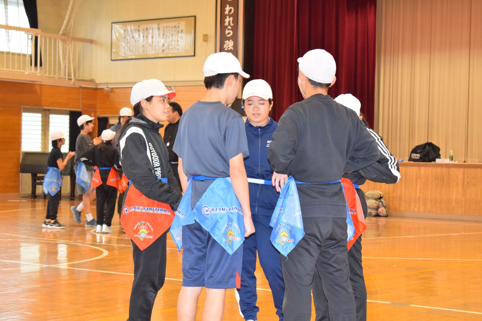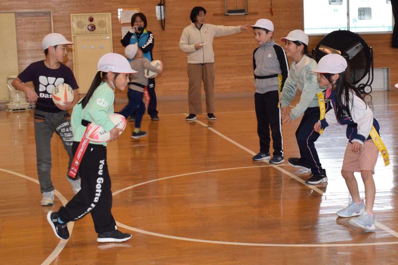 高学年は、実際のタグラグビーの試合です。具体的なルールを教えてもらい、子どもたちは、体育館で汗びっしょりになりながら、ボールを追いかけました。試合の合間にはチームで作戦を立てたり、声をかけあったりしながら活動しました。