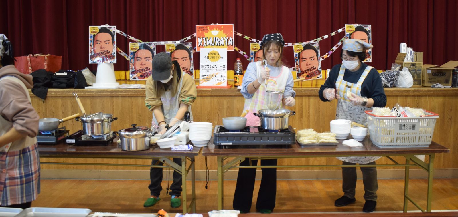 KIMURAYAのブースでは、うどん屋さんと射的です。うどんは「1玉」「半たま」と、お客さんのニーズを考慮した心遣い。射的は子どもたちも運営して大盛況でした。