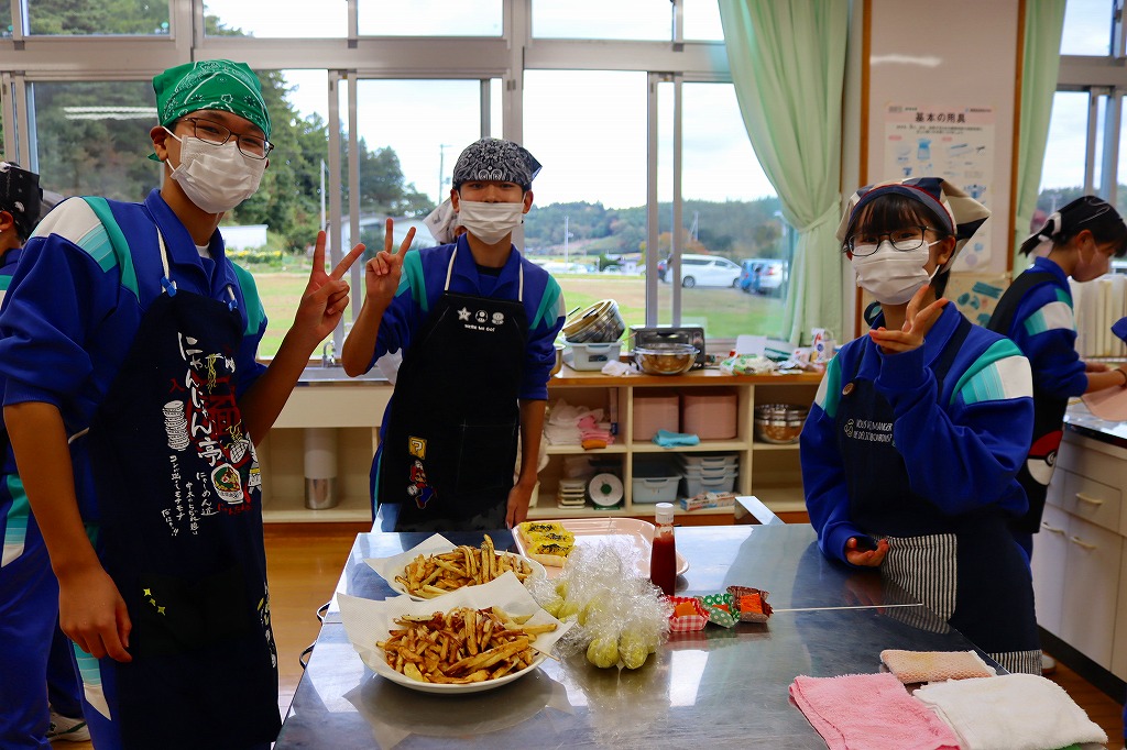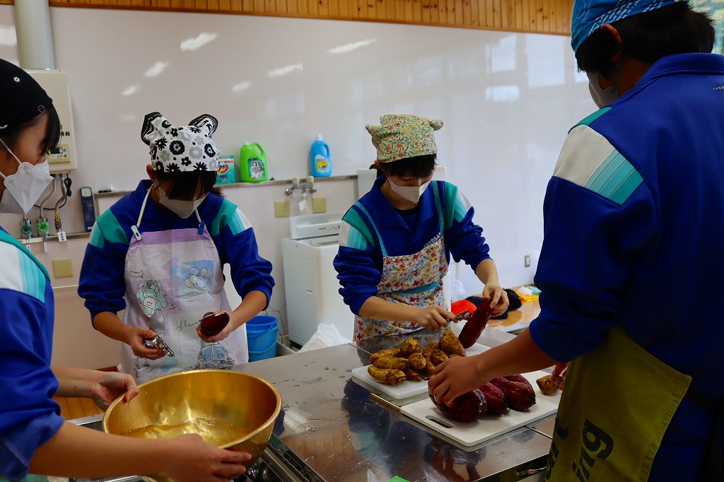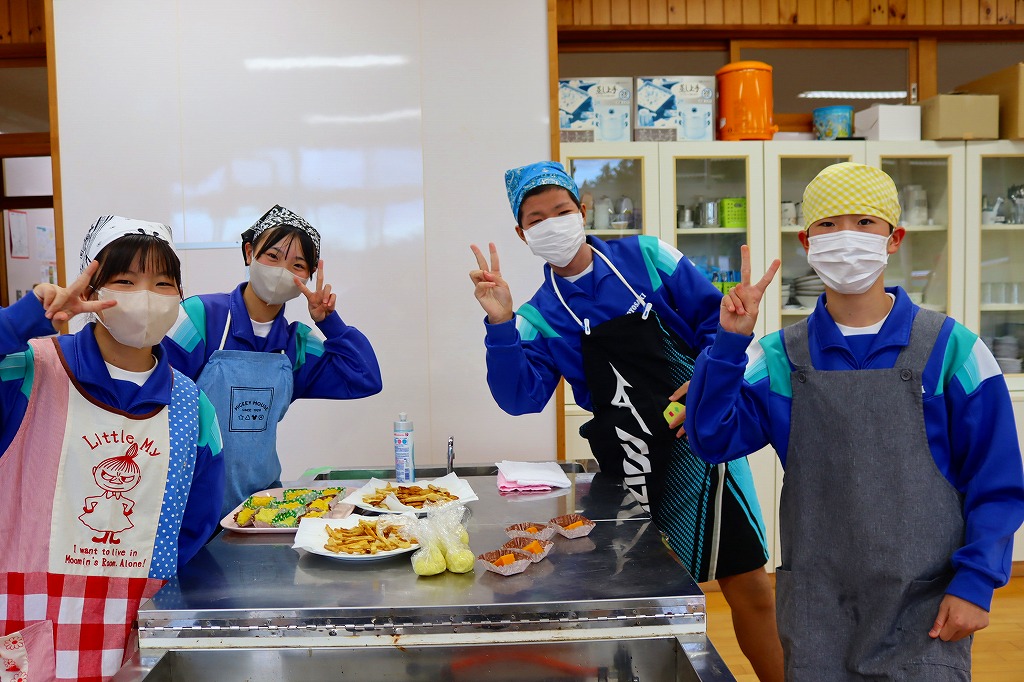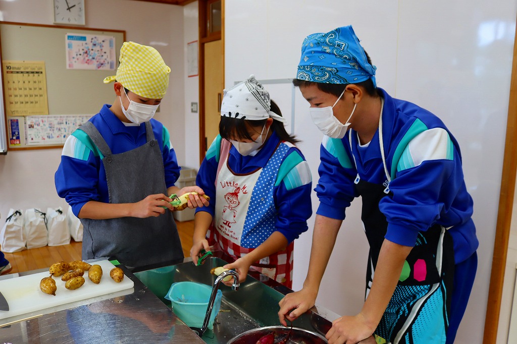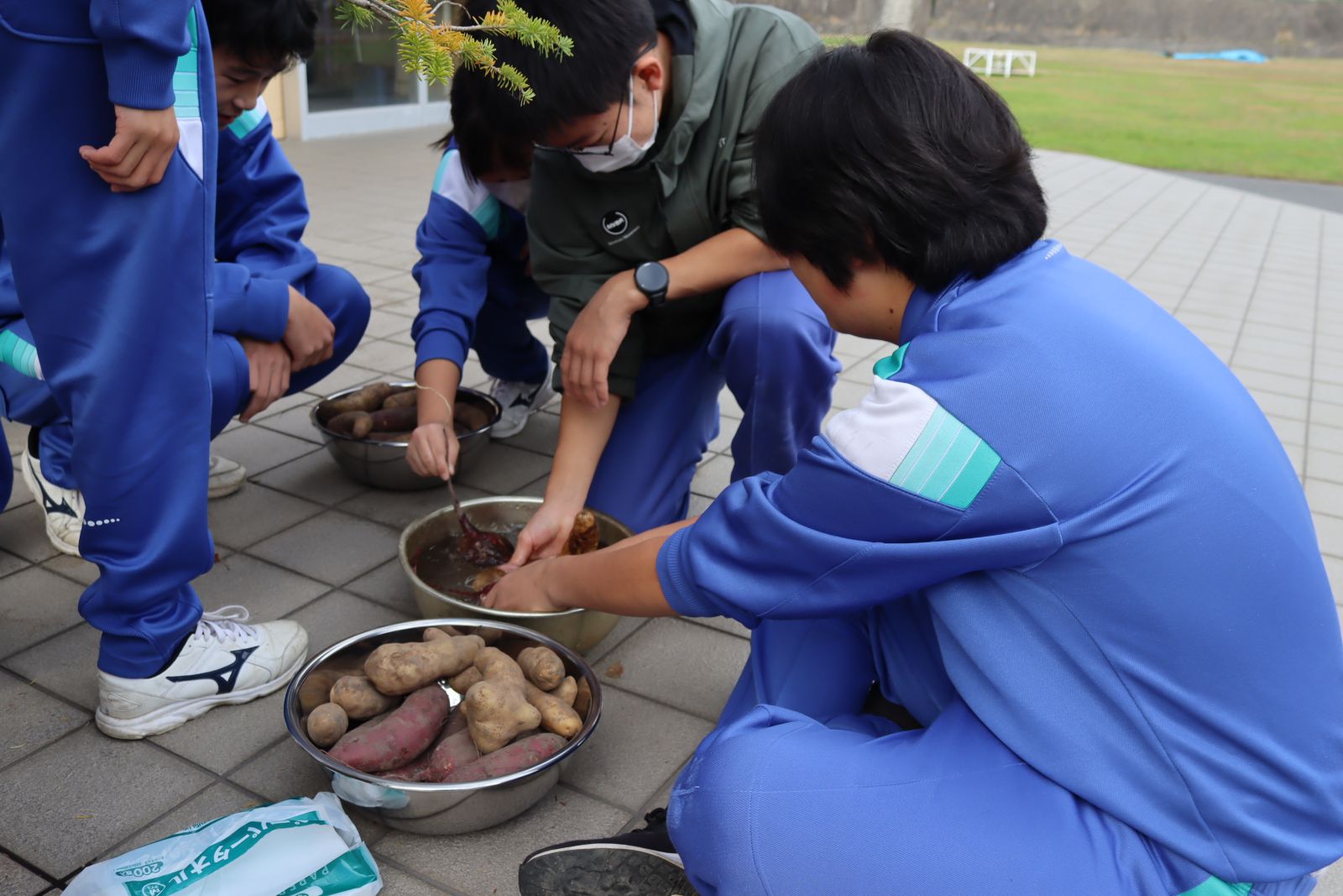 当日は、「焼き芋」「フライドポテト」「スイートポテト」作りに挑戦。異学年で構成された班編成で、学年関係なく協力できる良さを発揮しながら、生き生きと調理を進めていきました。自分たちでつくった「できたての料理」を食べ、生徒たちの表情は充実感に満ち溢れていました。苦労して収穫したかいがありましたね。農園にご協力くださっている山内さん、下田さん、本当にありがとうございました。