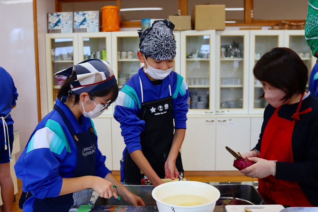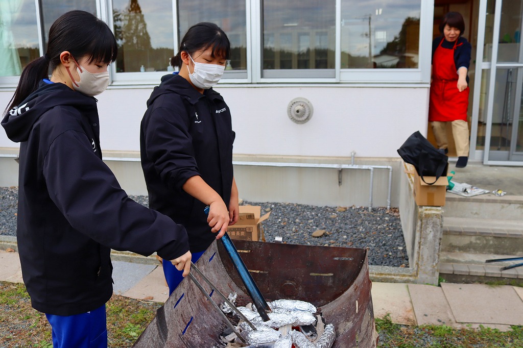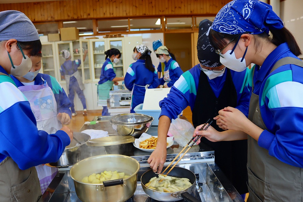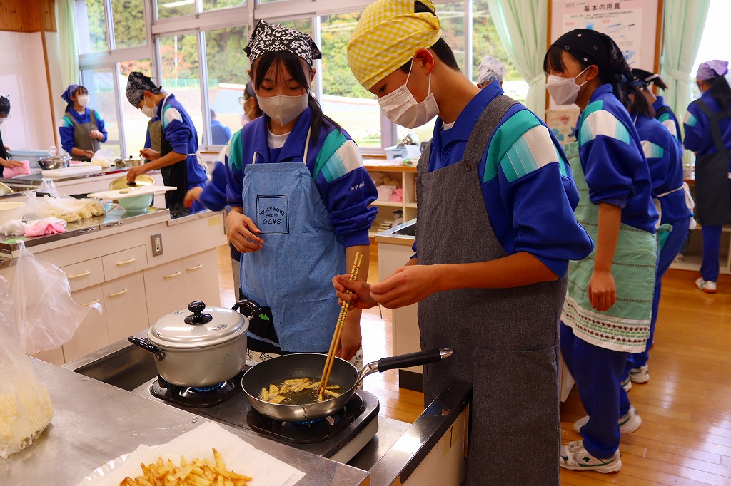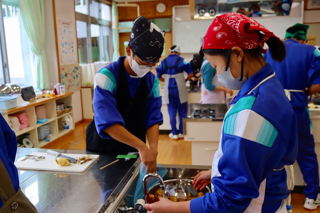 当日は、「焼き芋」「フライドポテト」「スイートポテト」作りに挑戦。異学年で構成された班編成で、学年関係なく協力できる良さを発揮しながら、生き生きと調理を進めていきました。自分たちでつくった「できたての料理」を食べ、生徒たちの表情は充実感に満ち溢れていました。苦労して収穫したかいがありましたね。農園にご協力くださっている山内さん、下田さん、本当にありがとうございました。