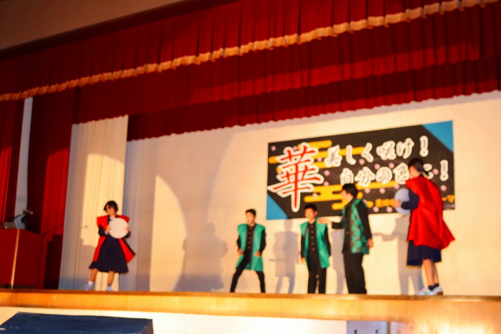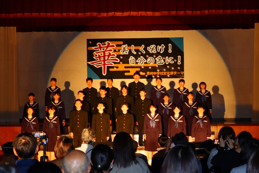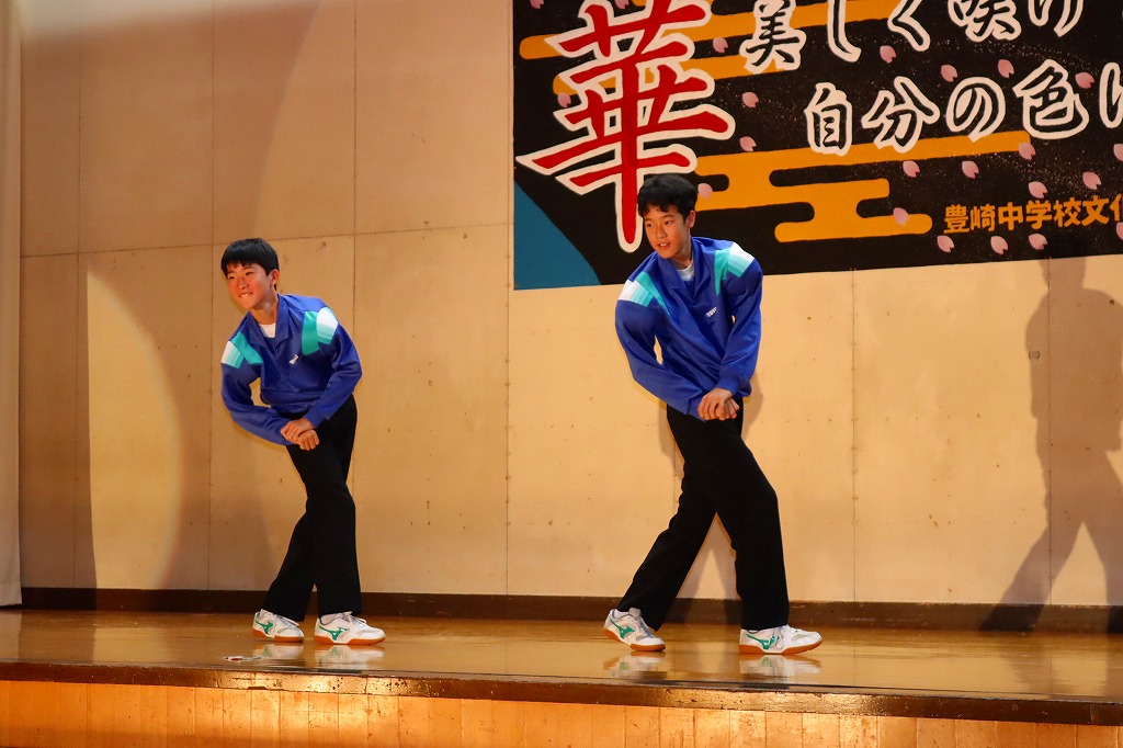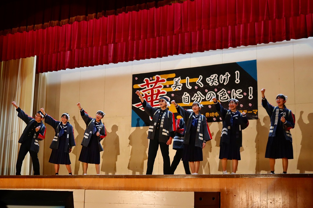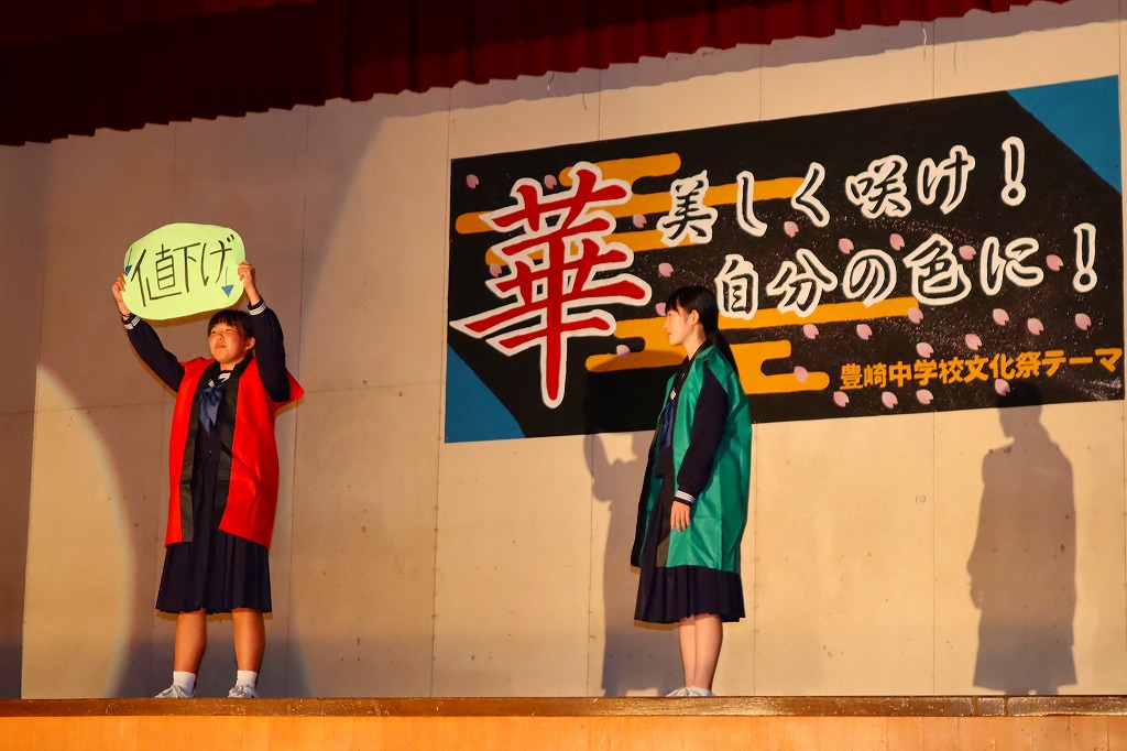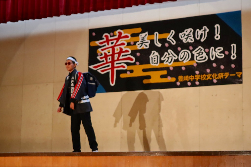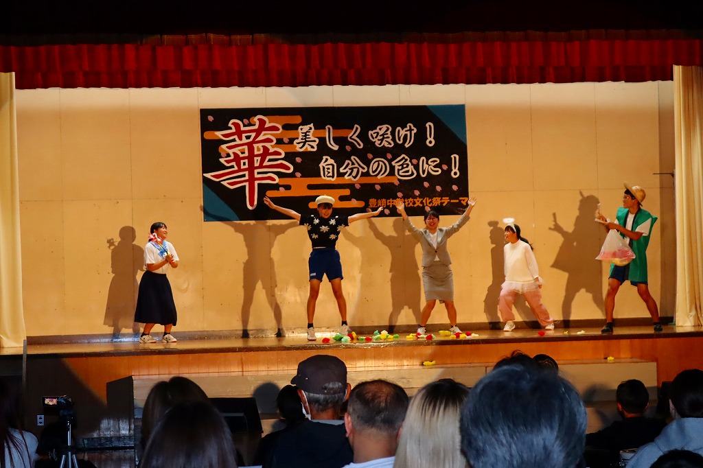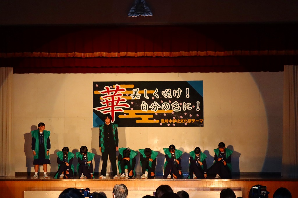 10月18日(土)、豊崎中学校の文化祭が開催されました。保護者・来賓・地域の方々あわせて約100名に御来場いただきました。こどもたちは、一人何役も掛け持ちしながら、2週間にわたる準備活動に精一杯取り組んできました。自分たちで考えて、創りあげる文化祭に、忙しさと多くの苦労もあったと思います。弱音を吐かず、どうしたらより伝わるかを考えながら、活動に取り組む姿に頼もしさを感じていました。 当日は、これまでの練習の成果を、すべてを出し切ることができ、見事大成功!!御来場の方々の盛大な拍手と温かいお声がけをいただき、子どもたちも、努力してきた分の達成感を味わうことができたと思います。保護者、来賓の皆さん、地域の方々、温かい御声援、本当にありがとうございました。